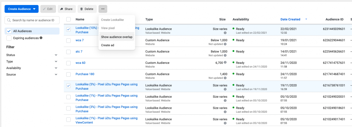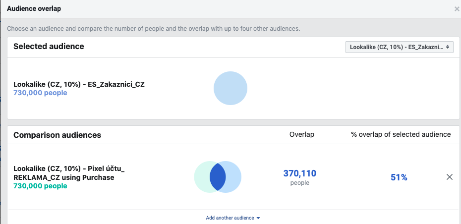 Pri lookalike publikách treba opäť dávať pozor či ich vytvárame z rovnakého zdroju resp. udalosti, ale len s väčším percentom. Vtedy sa môže stať, že nastane viac ako 50% prekrývanie. Zámerne sme pre demonštráciu využili lookalike publikum z nákupov za posledných 180 dní s 5% a 10% zväčšením. Tam je vidno, že ľudia, ktorí sú obsiahnutí v 5 % publika sa budú nachádzať aj v 10 %.