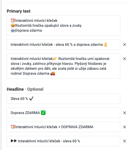 Pri nastavovaní reklamy vytvoríte jednu reklamu a môžete skombinovať až 10 obrázkov a videí, päť nadpisov a päť primárnych textových možností. Facebook použije tieto podklady na vytvorenie a testovanie viacerých kombinácií reklamy.