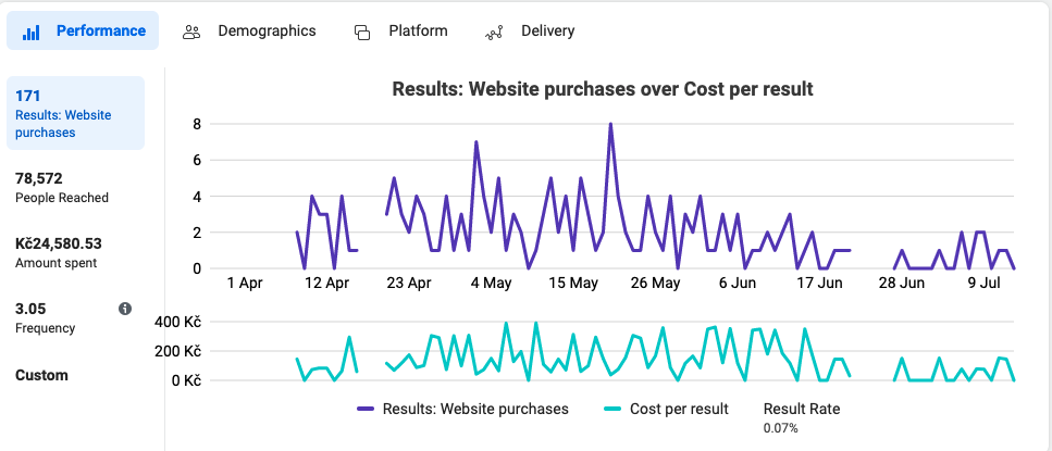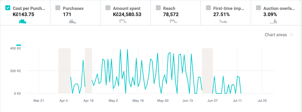 Do grafu máme možnosť pridať cenu za nákup, nákupy, celkovú útratu, dosah, pomer prvých zobrazení či mieru prekrytia aukcie. Graf vyššie naznačuje, že tieto metriky môžu kolísať, avšak jedná sa o bežnú vec pri aukciach. Je dôležité mať to pod kontrolou a v prípade dlhodobejšieho poklesu vedieť identifikovať dôvod.