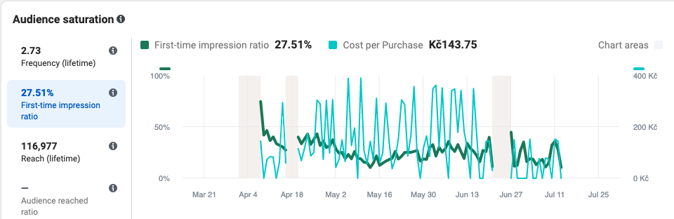 V nasledujúcej sekcii si môžete prezrieť prvé zobrazenia reklamy, resp. percentá zobrazení, ktoré pochádzajú od nových ľudí vo vašom publiku. Ak je toto číslo veľmi nízke, reklama je vystavená riziku únavy, pretože neoslovujete nových ľudí. V tomto okamihu začnete vidieť, ako sa zvyšuje vaša frekvencia, čo môže viesť k rýchlejšej únave reklamy.