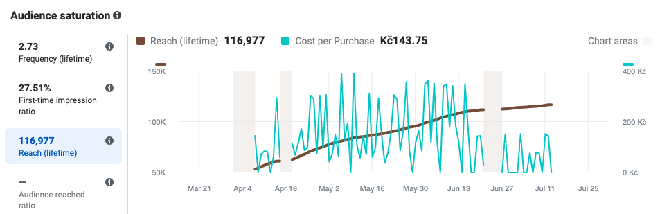 Posledná sekcia zobrazuje pomer dosahu publika, ktorému sme zobrazili reklamu. Môže to byť indikátor toho či sme plne oslovili svoje súčasné publikum.