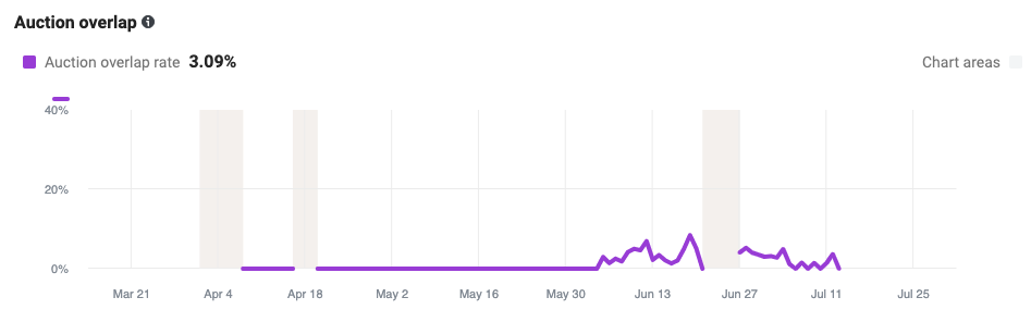 Pri pohľade na mieru prekrytia aukcie môžete zistiť, či reklamné sady necielia na príliš rovnakých ľudí. Ak máte mieru prekrytia 20 % a viac, pri niektorých reklamných sadách zvážte zmenu cielenia alebo použitie lepšej stratégie vylučovania publík.