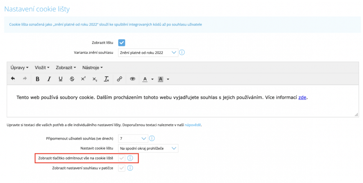 Cookies lišta musí jasně informovat uživatele o měření cookies a vybízet je k souhlasu či nesouhlasu. Aby lidé tyto cookies přijali či odmítli, Ondřej Chvojka za Shoptet doporučuje zvýšit její velikost či prodloužit její obsah, tak, aby zabrala více místa.