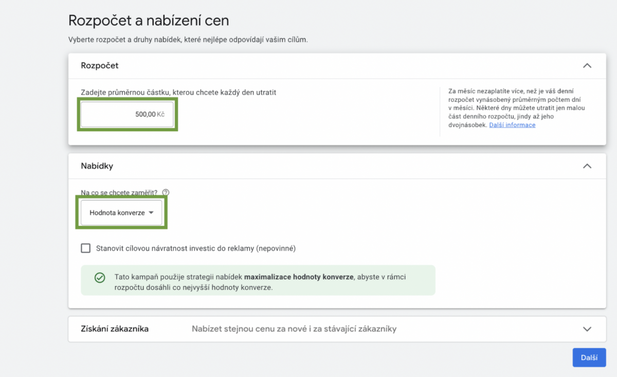 Zvolte dle vašeho rozpočtu. Nicméně počítejte s tím, že kampaň může spendovat za 1 den až dvojnásobek rozpočtu. Kampaň z počátku hodně testuje a tak se toto stává. Proto je lepší na začátek nastavit spíše menší rozpočet než jí ihned předat třeba 2000 Kč. Strategii nabídky zvolte dle svého uvážení. Můžete se rozhodnout na základě našich ostatních článků, kde se této problematice věnujeme.