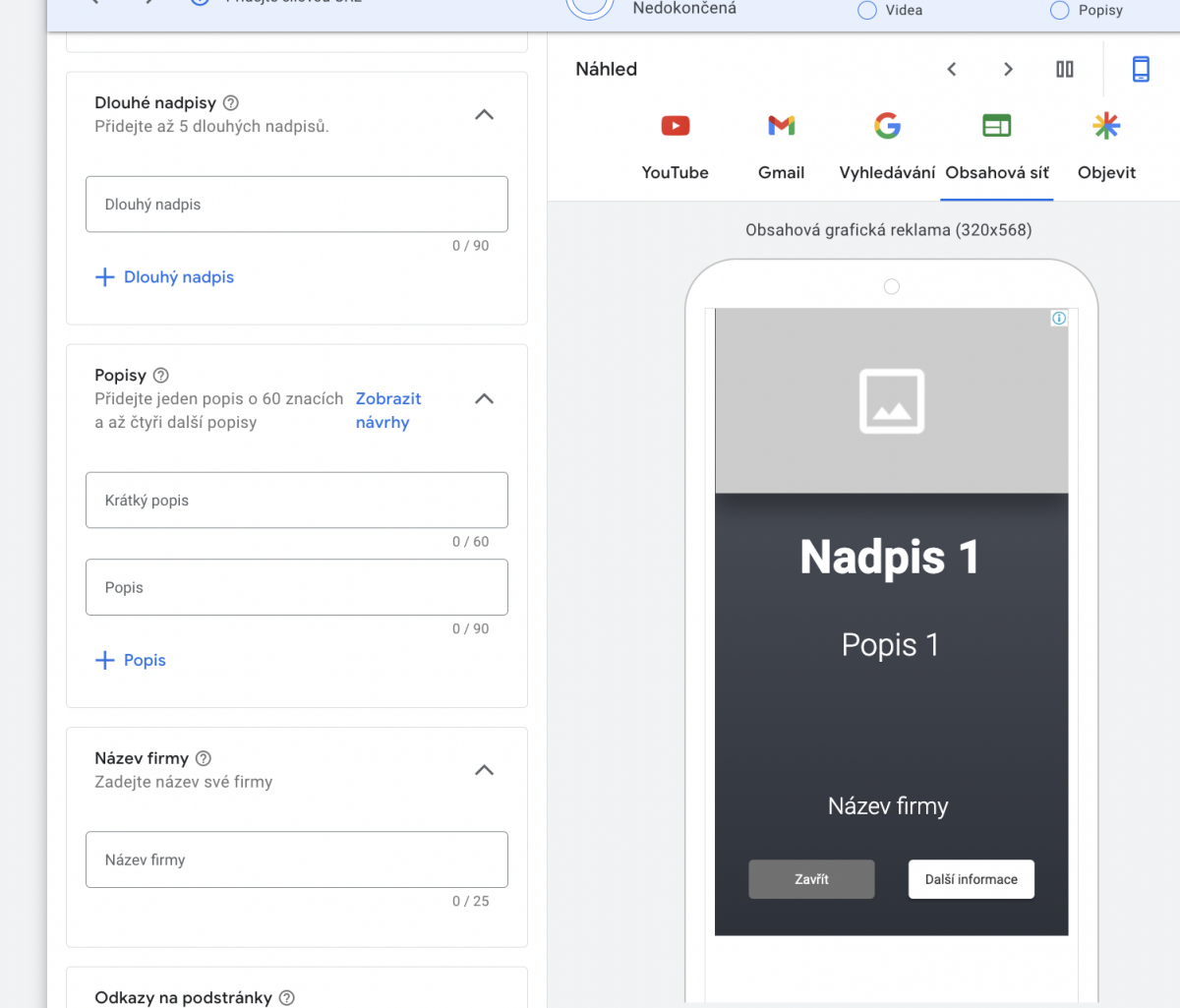 Většinou bývá předvyplněná URL, logo a název firmy.