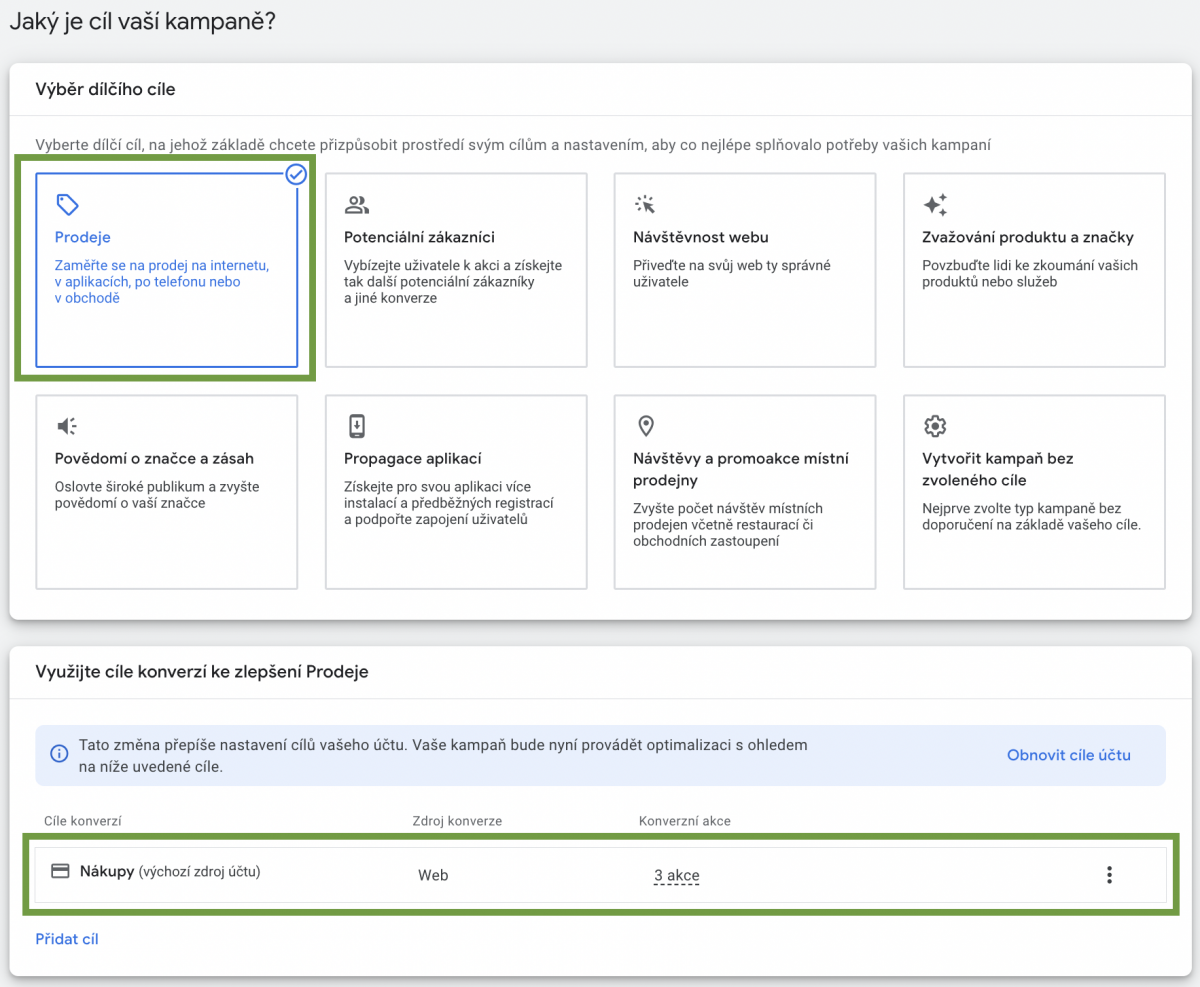 2. Vyberu si cíl “prodej” a nastavím si cíl konverzí (objednávka/nákup)