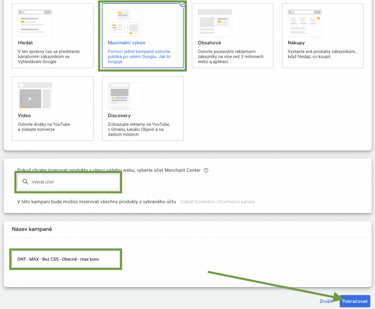 3. Vyberu typ kampaně “maximální kampaň”. Vykřížkuju daného CSS partnera. Případně nevyberu CSS partnera, pokud používám vícero (doporučujeme). A poté si pojmenuji kampaň. Do názvu je dobré napsat si typ strategie a také “bez CSS”, ať můžete rychle identifikovat, o jakou kampaň se jedná.