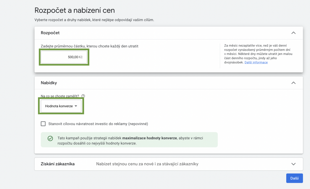 4. Rozpočet zvolte mezi 250-500 Kč. Počítejte s tím, že první dny bude kampaň spendovat dvojnásobek rozpočtu. Proto je lepší na začátek nastavit spíše menší rozpočet než jí ihned předat třeba 2000 Kč. U strategie zvolte “maximalizovat hodnotu konverzí”.