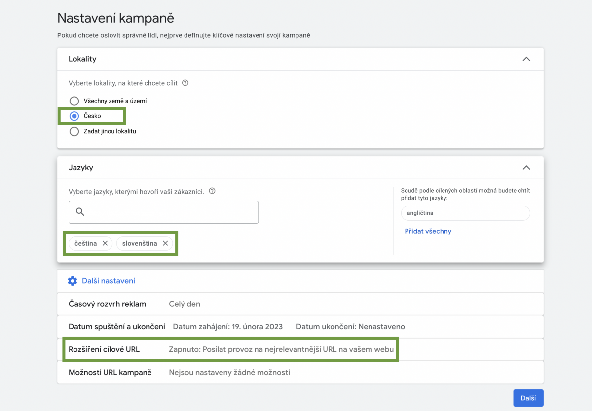 5. Vyberte požadovanou zemi. Vyberte jazyky - čeština + slovenština. Za zvážení stojí i ruština, angličtina, ukrajinština či vietnamština. Nicméně vzhledem k povaze kampaně, doporučujeme začít pouze s češtinou a slovenštinou. Rozšíření o URL nechte zapnuté (najdete při kliknutí na “další nastavení”).