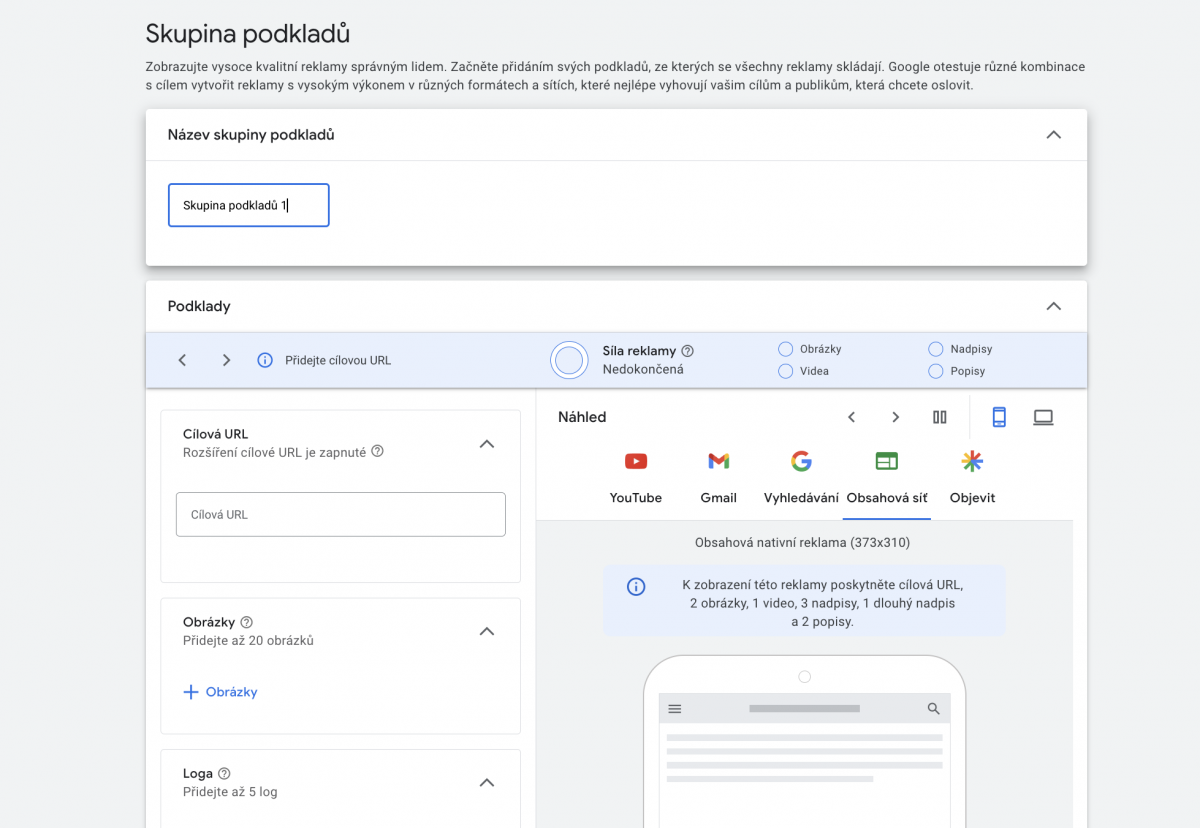 6. Vyplňte podklady, tedy reklamu. Nastavte zde obecné texty. (pokud chcete cílit na konkrétní kategorii nebo komunikovat určitou zprávu, je potřeba vypnout rozšíření o URL. Nicméně to je poté řeč o trochu jiném nastavení kampaně)
