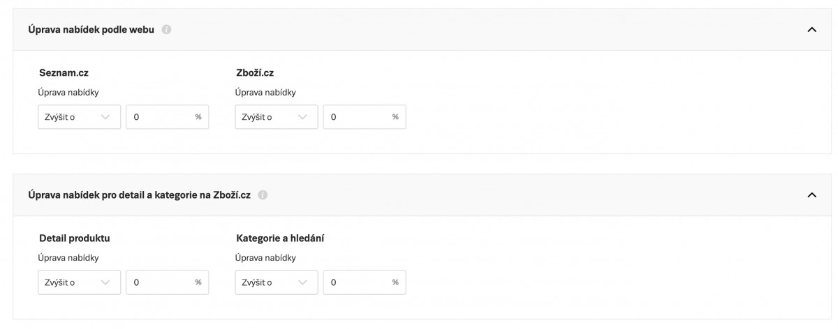 Kampaň se zobrazí přímo v rozhraní Skliku a můžete si ji nastavit dle vašich obvyklých zvyklostí. V nastavení kampaně je například možné změnit nabídky zvlášť pro Seznam.cz a zvlášť pro Zboží.cz