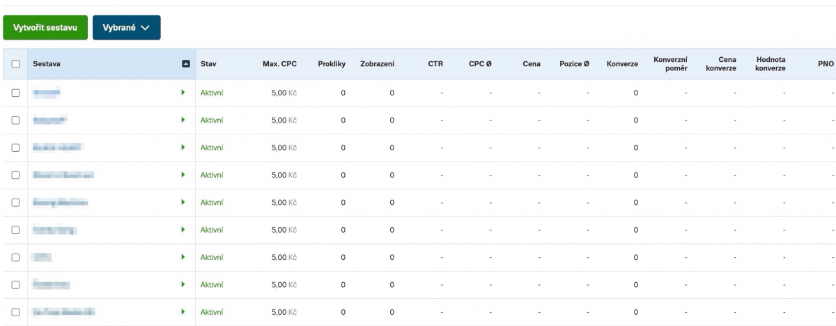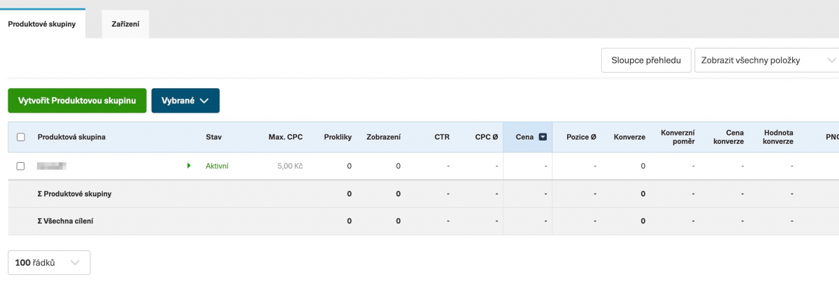 Podobně jako v produktových kampaních, i zde je možné vytvořit v kampani několik sestav a v nich vytvořit produktovou skupinu. Pro každou sestavu zvlášť je samozřejmě možné nastavit vlastní CPC tak, jak jste zvyklí.