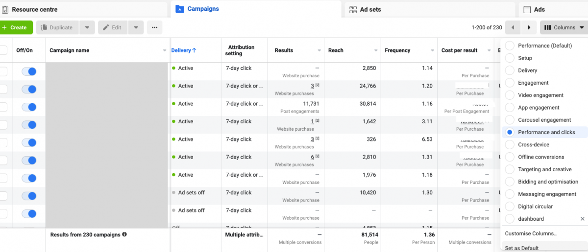 CPM a další základní metriky naleznete tak, že otevřete aplikaci Ads Manager a v nabídce sloupců vyberete možnost “Performance and clicks”. Potom vyberte časové období, které chcete vyhodnotit, a posunutím se dolů vyhledejte kampaň, kterou chcete zkontrolovat.