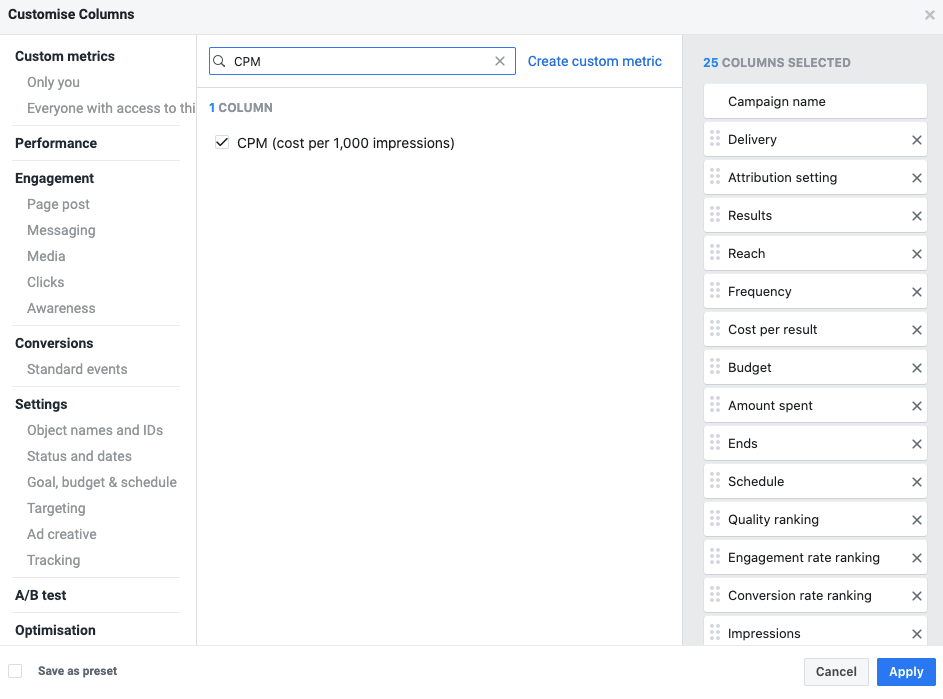 Případně si vytvořte vlastní sloupce kliknutím na Customize Columns. Potom přidejte CPM a další, abyste mohli efektivněji najít metriky, které jsou pro vaši kampaň důležité.