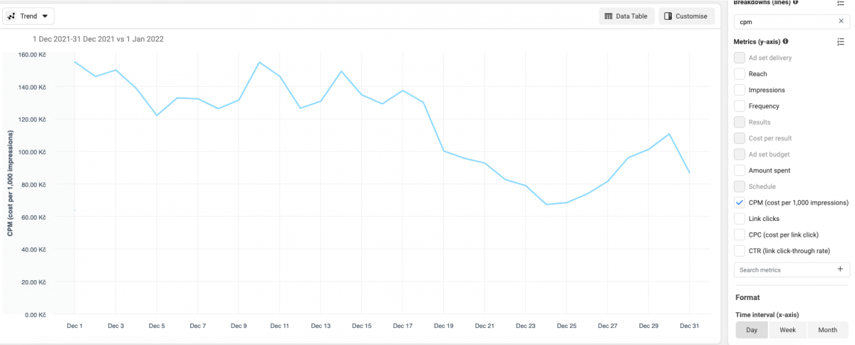 Chcete-li určit, zda je CPM vaší kampaně dobré, porovnejte jej s vlastními minulými výsledky. V Ads Manageru klikněte na Reports a ze seznamu metrik vyberte CPM. Potom změňte zobrazení na graf trendů, abyste viděli jak se CPM měnilo v průběhu času.