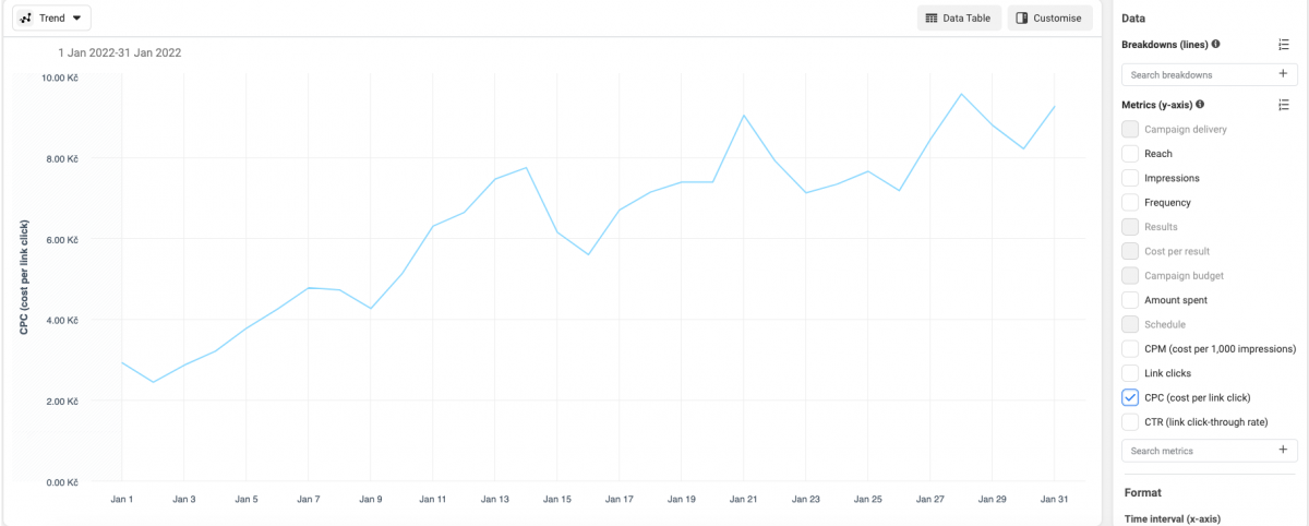 Celkovou CPC si můžete prohlédnout za libovolné časové období v Ads manageru nebo si ji můžete zobrazit v průběhu času v Reportech. Pokud je vaše CPC výrazně vyšší než benchmark hodnota v zemi nebo pokud má stoupající tendenci bez náznaků zastavení, možná budete muset přehodnotit nabídku, kreativu nebo copy.