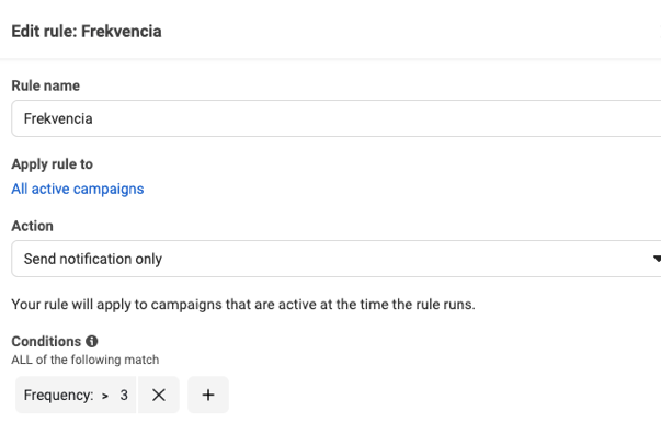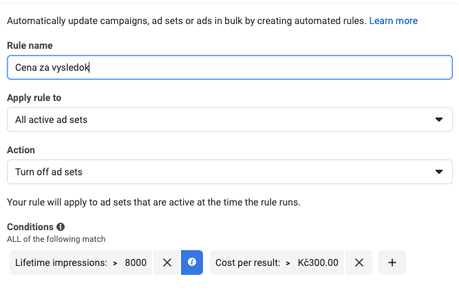 Pokud však náklady na výsledek překročí určitou hodnotu, možná budete chtít reklamní sadu ihned vypnout. Při vytváření pravidel souvisejících s útratami Facebook automaticky doporučuje přidat limit na počet impresí, abyste zajistili automatizaci kampaní, které již ukončily fázi učení.