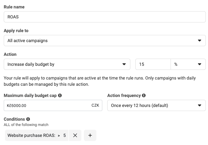 Když se kampaně dostanou do svého stádia a začnou přinášet optimální výsledky, můžete místo toho automatizovat škálování. Začněte nastavením podmínek. Například můžete chtít škálovat kampaň na Facebooku, když dosáhne určité hranice ROAS.