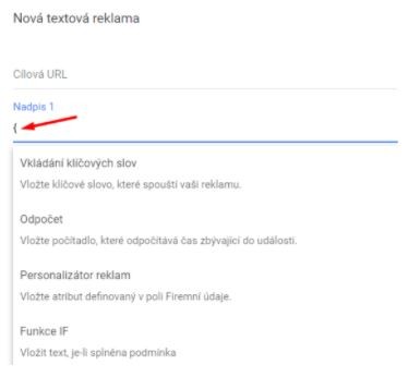 Dynamický text vytvoříme pomocí složené závorky ({). Jakmile ji do textu vložíme, vyskočí nám nabídka dynamických změn, z nichž vybereme hned první možnost, tedy Vkládání klíčových slov.