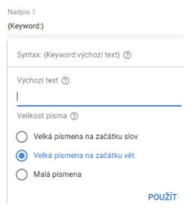 Jako výchozí text použijeme Stylové dámské plavky a do klíčových slov pro spuštění inzerátu vložíme například dámské plavky XXL, dámské sportovní plavky, plavky pro ženy s potiskem v přesné shodě. Pokud bude vyhledávací dotaz delší než povolený počet znaků nebo s chybným pravopisem, Google Ads jej nepoužije a v reklamě se tak zobrazí náš výchozí text, tedy Stylové dámské plavky.