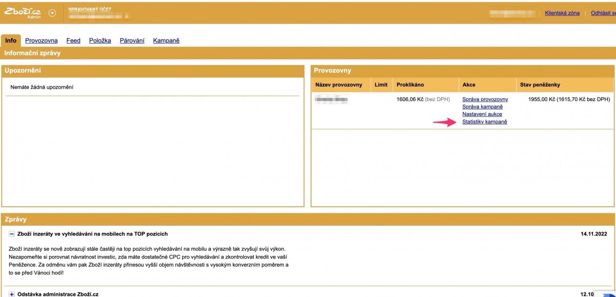 Štatistiky v Zboží nájdete na homepage admin.zbozi.cz -> provozovna -> štatistiky kampane.