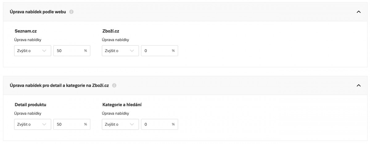 Tu si nastavíte, či chcete zvýšiť ponuku pre Zboží.cz a Seznam.cz, ďalej môžete zvlášť pre tovar zmeniť ponuky pre detail produktu a kategórie. Môžete si všimnúť, že v kampani máte defaultne nastavenú zostavu “Všetky produkty”, kde sú obsiahnuté, ako názov nečakane napovedá, všetky produkty obsiahnuté vo feede.