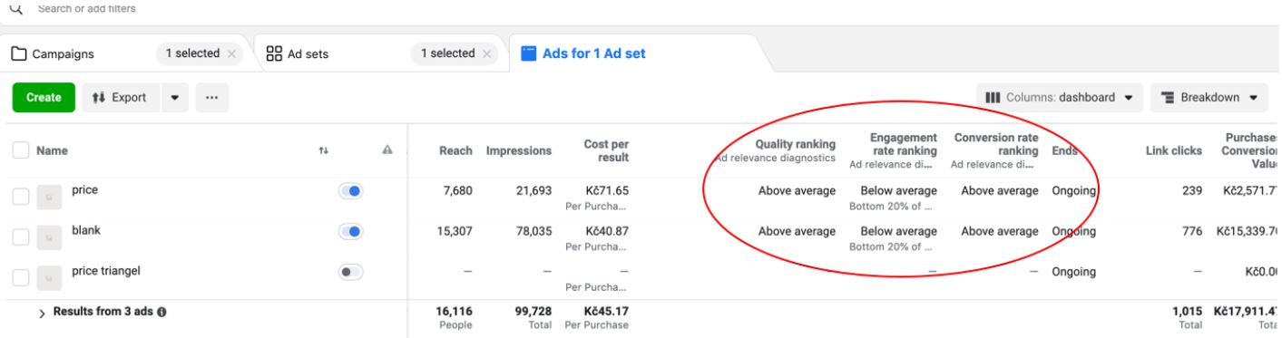 U našich reklám môžeme ku každej metrike skóre relevantnosti vidieť nasledovné: Podpriemer (Below average), Priemer (Average), Nad priemer (Above average). Podľa toho jasne vidíme, kde máme rezervy a tým pádom čo môžeme ešte zlepšiť aby sme dosahovali lacnejšie naše cieľe.
